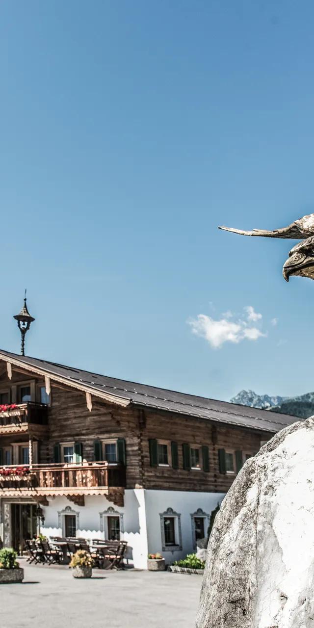 • Bronzene Adlerstatue auf Felsen vor Alpenhotel mit Außenterrasse und Bergblick