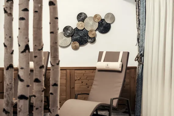 • Relaxation lounge with beige recliner chairs, birch trunks, and decorative wall art