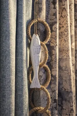 • Wooden fish decoration hanging on rope ring in front of patterned curtains